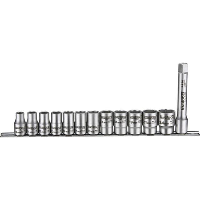 MS1213 | 13pc 1/2in dr .4430(SS) Skt Set 10-24mm(6-T) 13 piece 1/2 drive stainless steel 6-point sockets and extension bar supplied on a clip rail. Accessories: 1 clip rail complete with 13 1/2 drive socket clips, 5 extension bar. Regular Sockets: 10, 11, 12, 13, 14, 15, 16, 17, 18, 19, 21, 24mm.