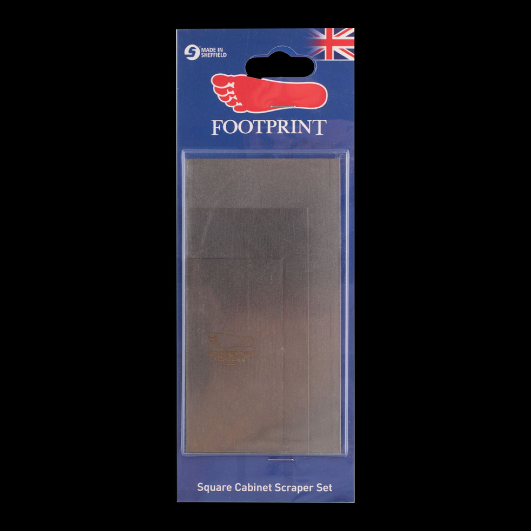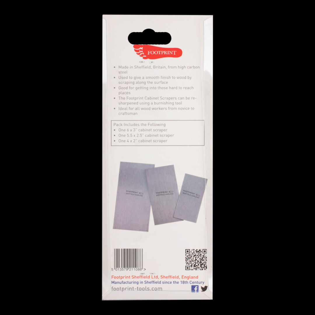 Set of three high-quality Footprint Cabinet Scrapers for precise wood shaping and finishing, made from durable high carbon spring steel.