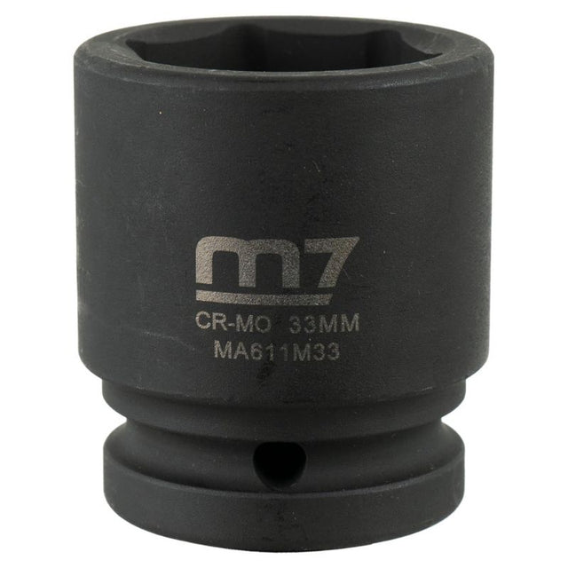 Introducing the M7 Impact Socket 3/4in Dr. 33mm, the ultimate tool for professionals and DIY enthusiasts alike. Crafted from high-quality chrome molybdenum steel, this 33mm impact socket is built to endure the toughest jobs, delivering unmatched performance and longevity. Designed to fit 3/4 inch drive ratchets, it provides a secure grip and effortless torque application, making it perfect for automotive repairs, heavy machinery maintenance, and construction work.