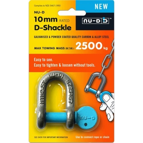 Easier to tighten and loosen without tools. Easier to see. A rated shackle with tested work load limit. High quality carbon and alloy steel, that's been drop forged and heat treated. Tested load limit 2500kg. NZS 5467:1993.