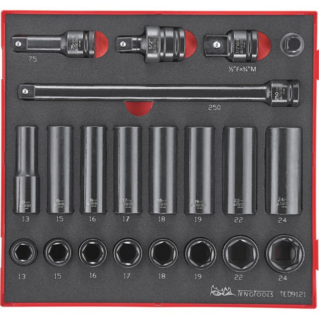 **TED9121 - 21pc 1/2in Dr. Reg/Deep Imp. Skt & Acc. Set 13-24mm-TED-Tray**