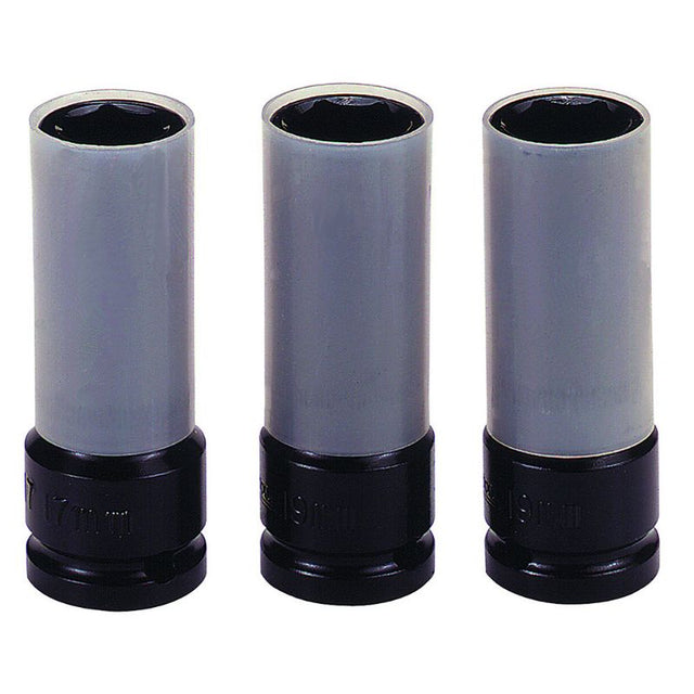 9203N - 3 Piece Wheel Nut Socket Set made from Chrome Molybdenum with protective inserts. 1/2 drive - 17mm, 19mm, & 21mm.