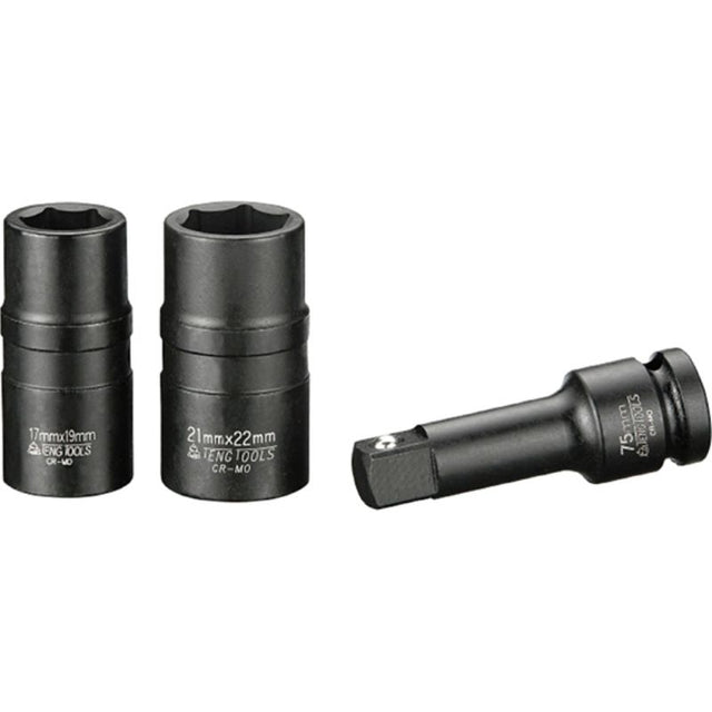 TENG 3PC WHEEL NUT SOCKET SET: Impact wheel nut socket set with two 1/2in drive reversible sockets in varying sizes and a 3in/75mm extension bar. Sizes include 17 x 19mm and 21 x 22mm.