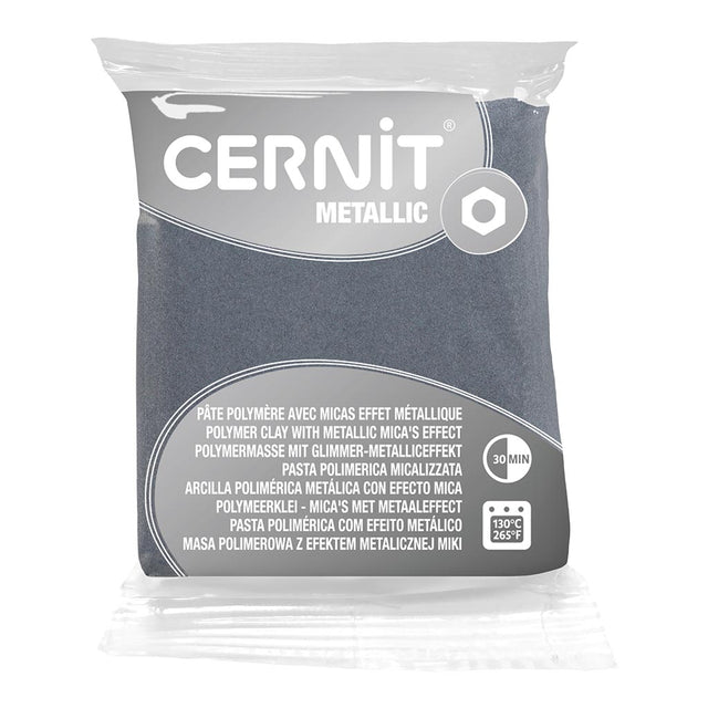 Cernit Metallic is an oven hardening polymer clay, heavily laden with metallic mica particles . Easy to condition and cures to a very strong, flexible finish that sands and buffs beautifully. Preheat oven and bake or cure at 110°C for 30 minutes. Block size 56grams. Silver.