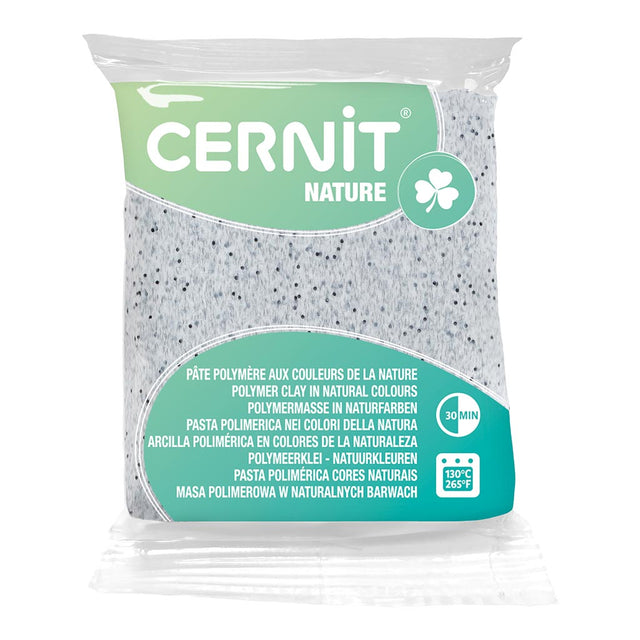 Cernit Nature Range features realistic stone effect colors that provide a porcelain-like finish, making it an excellent choice for both beginners and experts. This versatile material is easy to work with, allowing for a range of creative projects. Once your modeling is complete, simply place it in a home oven preheated to 110-130°C for about 30 minutes. Block size 56 grams. Granite.