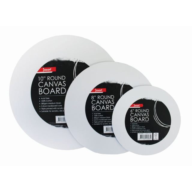 Jasart Round Canvas Boards are primed canvas die cut on a firm 3.5mm hardboard core base with backing paper.