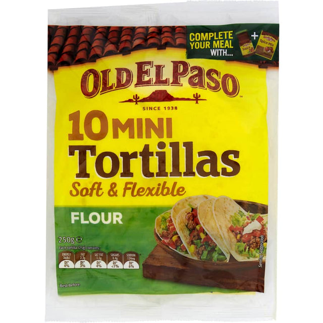 Indulge in the authentic taste of Mexico with Old El Paso Mexican Mini Tortillas 250g! These mini tortillas are a must-have for creating mouth-watering soft tacos, a beloved Mexican street food classic. Crafted to be even softer and more pliable, they are perfect for all, including little ones. Elevate your meal and #makeityourway by filling them with seasoned mince beef, succulent shredded chicken, or flavorful beans. Top it off with zesty salsa and fresh ingredients for a dining experience that brings everyone to the table within seconds!