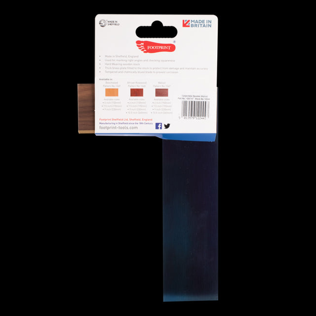 Footprint Carpenters Squares are a trusted tool used by craftsmen worldwide to mark and verify right angles on wood and between joints. The hardened steel blade of the square has been chemically blued, providing a layer of protection against corrosion. Three fitted brass rivets secure the blade to the stock, ensuring stability and precision during use. Additionally, a thick brass plate is affixed to the stock, creating a durable working edge that extends the life of the tool while also maintaining its squareness. The stock itself is made from high-quality Walnut wood, which is a hardwood that is not a protected species. All of these make the Footprint Carpenters Square an exceptional tool for anyone working with wood. Proudly made in Sheffield, Britain.