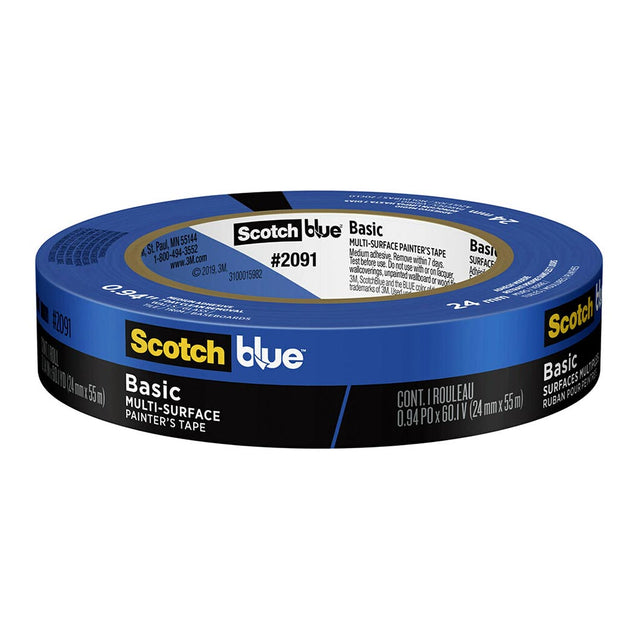 ScotchBlue Basic Painters Tape is a great tool to help you paint sharp, clean, and precise lines. Use it to protect your wood trim, painted walls, tile floor, or glass windows from paint and drips. This multi-surface tape can stay on surfaces for up to 21 days and then removes easily without leaving any sticky residue behind. 24mm x 55m roll. Blue Colour.