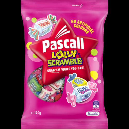 Dive into the delightful world of Pascall Lolly Scramble 170g, a classic favorite from New Zealand that promises to scatter joy with every bite! This tempting mix, comprised of an assortment of colorful, fruity and milk-flavored chewy candies, is perfect for sharing and enjoying at gatherings, parties, or just as a sweet treat during your everyday moments. Each pack of Pascall Lolly Scramble is bursting with vibrant, chewy morsels that offer a satisfying texture and a burst of sweet, indulgent flavors that New Zealanders have loved for generations. Whether you're reliving cherished memories or creating new ones, Pascall Lolly Scramble is your go-to snack for adding a touch of sweetness to every occasion. Suitable for all ages, this 170g bag is easy to carry and convenient for any moment that calls for a little extra joy. Get your hands on Pascall Lolly Scramble today and savor the taste of happiness that has been bringing smiles to faces for years. Ideal for the candy lover who craves a mix of flavors and textures, these lollies are packed with quality and tradition. Indulge in the rich heritage and delightful chewiness of Pascall's confections. Now available at Smartfox AU, your premier online destination for the finest snacks and treats.