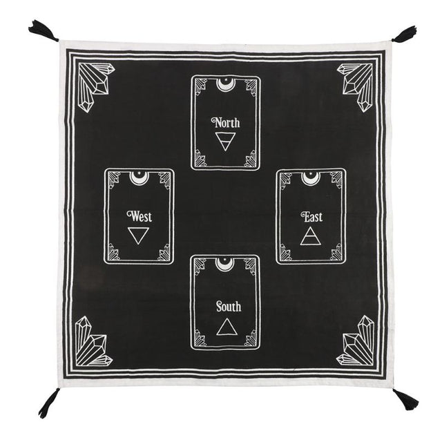 H:70 x W:70 x D:0.2 cm - Useful for tarot spreads, this cotton altar cloth features corner tassels and white 'north', 'south', 'east' and 'west' designs for a four-card tarot spread. Use for tarot readings, creating a sacred altar space or as mystical home decor. Part of the Fortune Teller range of gifts and home decor.