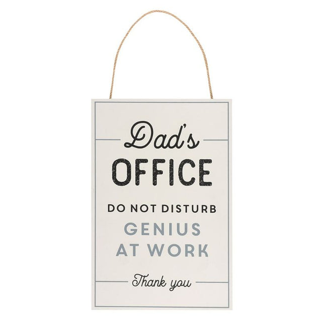 H:30 x W:20 x D:0.75 cm. A hanging sign for decorating Dad's office. Features text that reads 'Dad's Office. Do not disturb. Genius at work. Thank you.' and a string for hanging. Makes a great gift for Father's Day and birthdays. 30cm. tall, not including string. part of the Daddy Cool range of gifts and homeware for men.