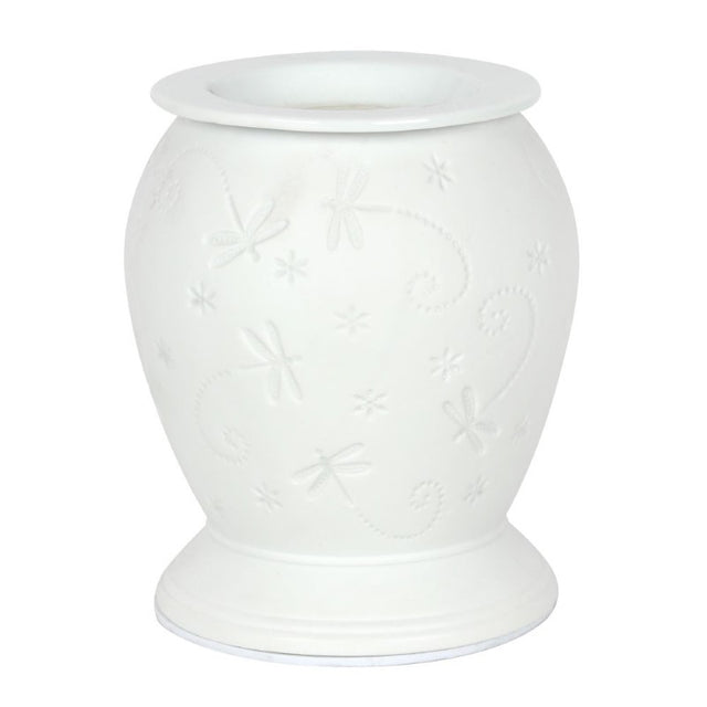 H:15.5 x W:13 x D:13 cm - This white ceramic oil burner and wax melt warmer features a dragonfly design illuminated by a warm yellow glow when the burner is switched on. Add fragrance oils or soy wax melts to the dish and the gentle warmth from the burner will allow the fragrances to infuse into the home.