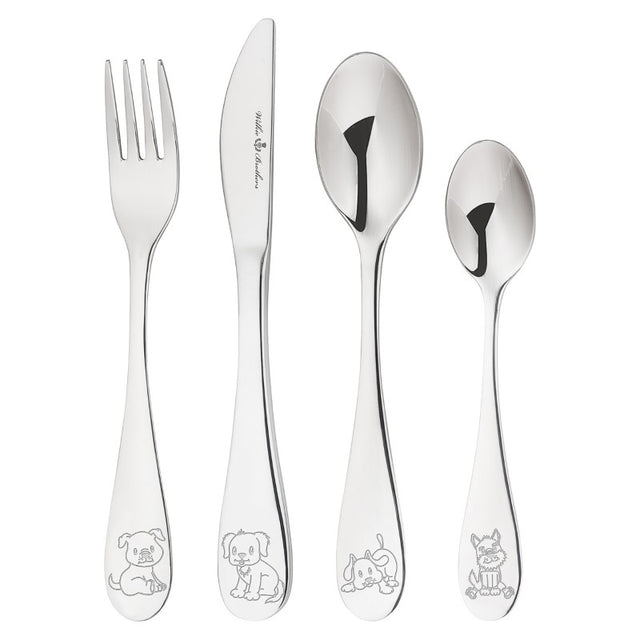 Introducing our delightful Kids Cutlery - Wilkie Puppy (4pc), designed to make mealtime fun for children aged 3 years and up. Specially crafted for tiny hands, this adorable cutlery set includes a fork, knife, spoon, and a cute embossed Wilkie Puppy character that adds a playful touch to every meal. Made from high-quality 18/10 stainless steel, this kids' cutlery not only boasts a brilliant high-mirror finish but is also durable enough to withstand everyday use. The ergonomic design is perfect for promoting self-feeding skills in toddlers while ensuring they enjoy their favorite foods safely.