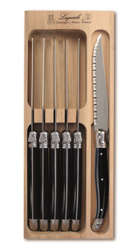 Introducing the Steak Knives Set of 6 from Andre Verdier, a premium addition to your kitchenware collection. Crafted in France, this exquisite set features the renowned Laguiole Debutant Range, ensuring both elegance and functionality. Each knife boasts a stainless steel blade, delivering precise cutting for all types of meat, from juicy steaks to tender roasts. The handles are made from high-quality colored resin, providing a comfortable grip and a pop of color that enhances your dining experience. With the iconic Laguiole Bee emblem, this set exudes authenticity and tradition. Packaged in a beautiful wooden tray, these steak knives are not only practical but also make a stunning centerpiece for any table setting. Enjoy the convenience of being dishwasher safe, making cleanup effortless after your meals. Whether you're hosting a dinner party or enjoying a family meal, the Andre Verdier Steak Knives will impress your guests and elevate your culinary presentation. Perfect for gifting, this set is ideal for weddings, anniversaries, or any special occasion. Experience unparalleled craftsmanship with these premium steak knives that blend form and function seamlessly. Upgrade your dining experience today with the Steak Knives Set of 6 from Smartfox, where quality meets contemporary style.