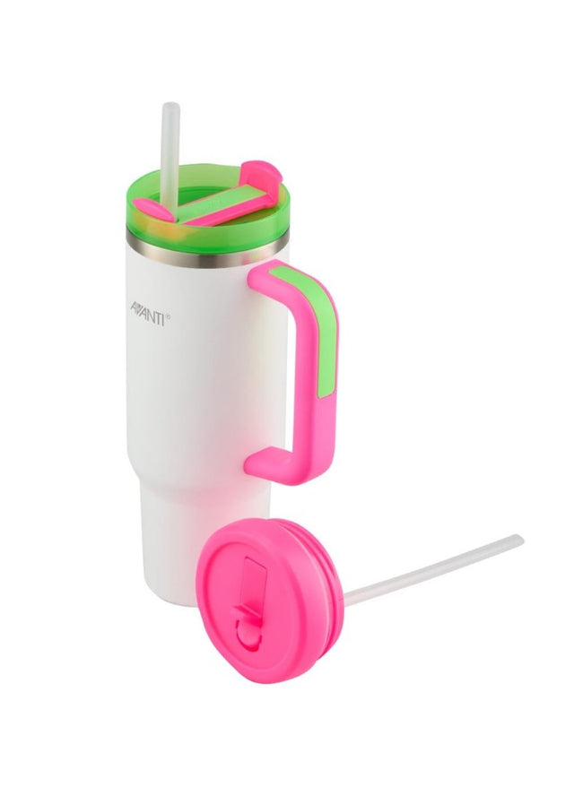 Introducing the AVANTI HydroQuench Tumbler with Two Lids in vibrant Lollipop color, the ideal companion for your hydration needs. This innovative 1L tumbler features advanced Aircore Technology—its double wall vacuum insulation keep your beverages at the perfect temperature, whether it's hot coffee or icy water. Constructed from high-grade stainless steel, this durable and eco-friendly tumbler ensures safe sipping as it is BPA free and phthalate-free. The soft touch exterior brings a comfortable grip that fits perfectly in your hand, while the ergonomic carry handle provides added convenience. Designed for versatility, the HydroQuench comes with two interchangeable screw-top lids, including a sipper lid with an airtight, leak-proof silicone seal for spill-proof drinking. The splash-proof multifunction lid boasts a three-point revolving dial, allowing you to seamlessly switch between a reusable removable straw, an open spout, or a closed lid. With a wide mouth for easy filling and cleaning, plus a recessed base ensuring compatibility with standard car cup holders, this tumbler is perfect for on-the-go hydration. Elevate your drinkware collection with the AVANTI HydroQuench—style and function in one. Enjoy eco-friendly, drip-free sipping with AVC HydroQuench today and stay hydrated in style!