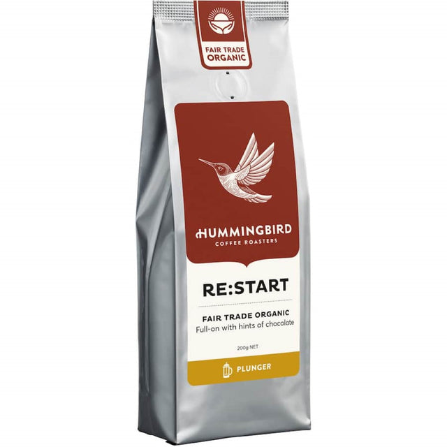 Re:start plunger grind coffee : medium roast with a hint of dark roast : fair trade 100% organic coffee from certified sources.multiple origins are blended to create a complex coffee. Nutty, chocolaty notes with just enough zing (acidity) to keep it lively, yet smoothly balanced.hummingbird selects specialty-grade beans from trusted growers, before carefully roasting then blending by hand to create a distinct, memorable coffee you'll look forward to every day.roasted & blended in new zealand.• for every $100 of green coffee beans brought, hummingbird donates $1 to support local communities.• fresh is best: we recommend you keep your coffee in a cool dark & dry place in an air tight container.• hummingbird is proud to support the soft plastics recycling program. Drop off your empty packaging into recycling bins in selected stores.• net weight: 200g pack.