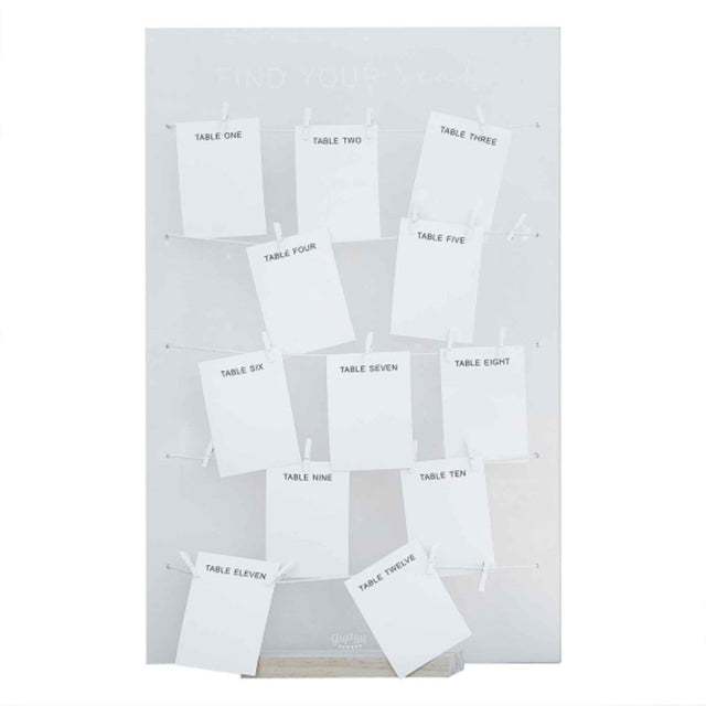 The perfect way to display your table plan to guests at your wedding, this acrylic table plan comes with a wooden stand with 'Find Your Seat' text, and then is completed with table number cards and white twine.