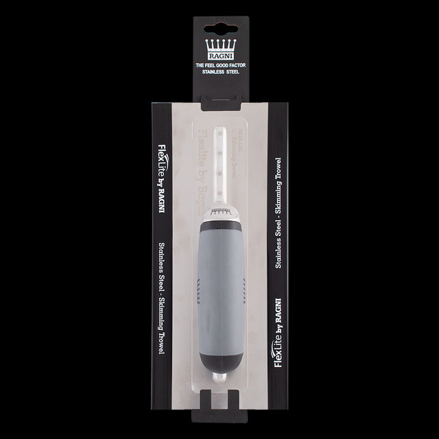 To help you achieve a perfect finish, Ragni combines precision machine-based production techniques with hand-crafted finishing. This Ragni skimming trowel has a 280mm (11") wafer-thin flexible blade made from top-quality Japanese stainless steel. Its lightweight aluminium alloy mounting with a swept-back design helps to reduce fatigue. Featuring a "Hi-lift" handle, designed to transfer maximum power from hand to trowel effortlessly. It also offers a deeper knuckle clearance between the handle and the trowel, which is perfect for larger hands. Blade has rounded corners to prevent digging-in and reveal a smooth finish.
