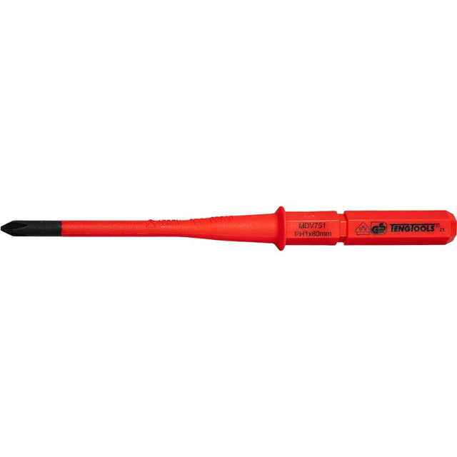 MDV751 | Teng 1000V Screwdriver Interchangeable PH1 Slim "˘ PH blade 1 000 volt insulated screwdriver blade "˘ For use with the interchangeable blade handles (MDV700 or MDV710) "˘ Approved for live working up to 1 000 volts "˘ Integrated protective insulation with two colours to clearly indicate if there is any damage to the insulation "˘ Reduced blade diameter giving an ultra slim blade for easier access to recessed screws and spring elements "˘ For use with Phillips type screws "˘ TT-MV PLUS steel alloy for greater strength and material flexibility