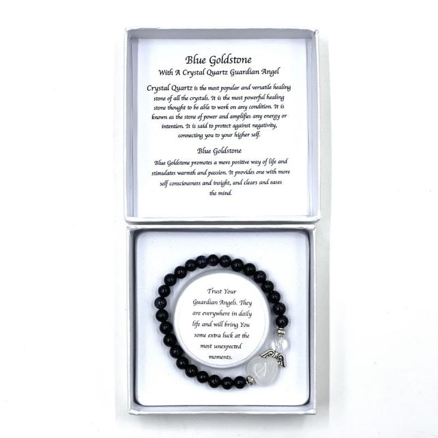 Explore tranquility and protection with our stunning Blue Goldstone Crystal Heart Guardian Angel Bracelet, perfect for those seeking a touch of elegance and spiritual guidance. This beautifully crafted bracelet features 6mm beads made from mesmerizing blue goldstone, renowned for its soothing vibes and shimmering appearance. Each bead is believed to promote optimism, confidence, and creative inspiration, making it an ideal accessory for daily wear or special occasions.
