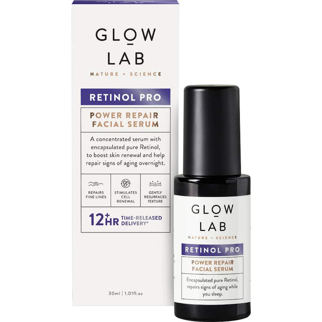 Glow Lab Retinol Pro Power Repair Facial Serum is a concentrated facial serum powered by encapsulated pure Retinol (Revitalide„˘), desgined to deeply penetrates the skin to stimulate cell turnover, boost skin renewal and help repair signs of aging while you sleep.
