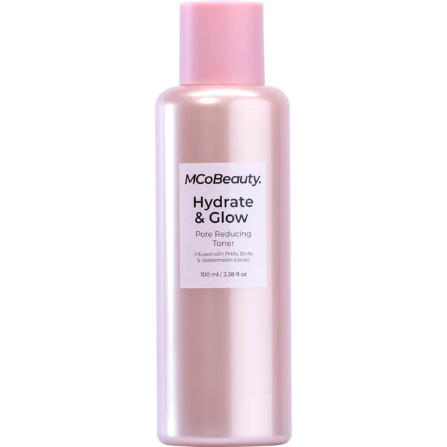 MCoBeauty HYDRATE & GLOW PORE REDUCING TONER is a multi-use toner that gives your skin a dewy, bouncy look and preps it for makeup application. Containing an ultra-gentle blend of Willow Bark Extract and Gluconolactone, BHA and PHA exfoliants help dissolve oil and impurities within your pores, smooth the feeling of your skin, and prompt a touchably softer texture. Hyaluronic Acid and Watermelon Extract deliver a juicy hit of hydration, helping your skin appear healthy and luminous. With consistent use, this formula contributes to a plumper skin appearance with fewer visible pores. It's perfect to apply before makeup, helping to create a supple and hydrated base for glowy looks.