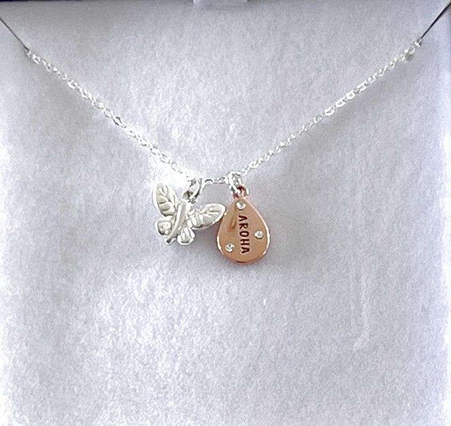 Experience the beauty of the Equilibrium Aroha/Butterfly Necklace, a stunning piece that symbolizes change and personal growth. With its delicate butterfly design and the meaning of Aroha, meaning love in Maori, this handcrafted necklace is an exquisite blend of nature and symbolism, perfect for any occasion. Its lightweight construction ensures comfort and style, making it ideal for layering or wearing alone as a statement piece. Whether treating yourself or gifting a loved one, this necklace serves as a reminder to embrace transformation and appreciate the beauty in life's journey. Let the butterfly's energy guide you and inspire resilience and personal growth. Explore our collection and find your equilibrium with this unique accessory that reflects your individuality and love for nature.