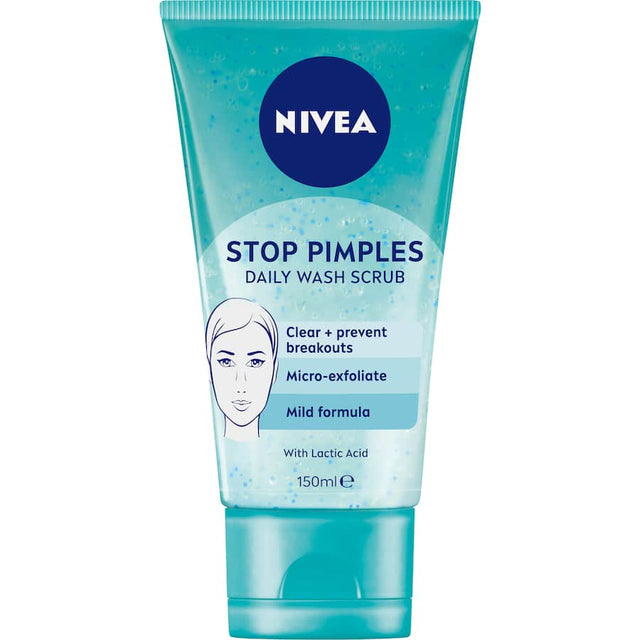 Stop pimples in their tracks with NIVEA Stop Pimples Daily Wash Scrub. With its anti-bacterial formula, you get a deep cleansing of your skin, helping to unclog pores and clear existing pimples. The quality formula contains naturally derived micro scrubs and uses ingredients such as natural Magnolia Extract and Lactic Acid to be effective while also gentle on the skin, also providing you with a natural and pleasant fragrance on application. The gentle scrub cleans the skin by unclogging blocked pores and micro-exfoliating, to smooth the complexion and help to prevent future spots and blackheads. Simply apply to wet skin and massage into your face. Avoid contact with eyes