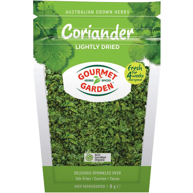 Gourmet garden lightly dried coriander is made with australian grown coriander that is roughly chopped and lightly dried (just enough) for fresher flavour that lasts for 4 weeks one opened.