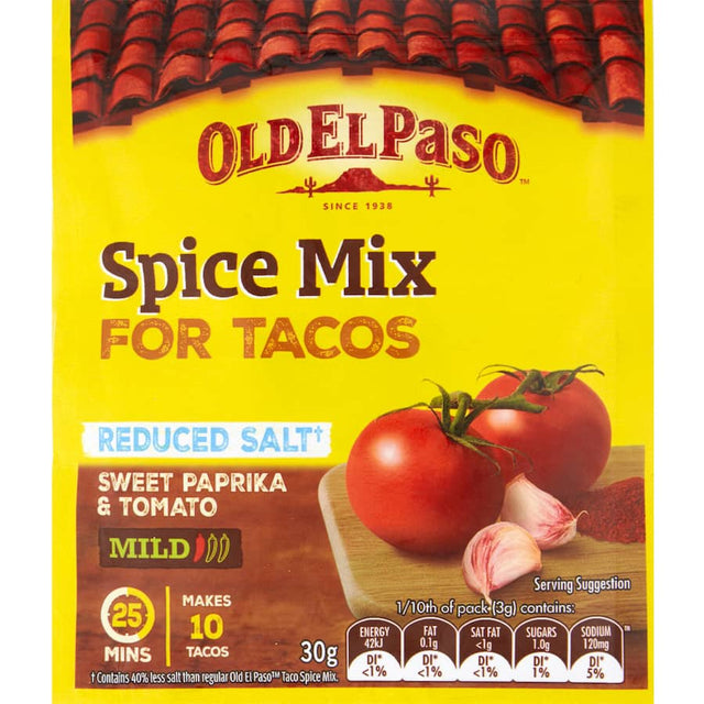 A delicious blend of mexican spices, tomato, cumin and oregano with a little less salt. Add to pan fried mince for a rich and saucy taco filling. - contains 40% less salt than regular old el paso. Taco spice mixes