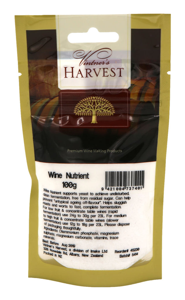 Unlock the potential of your wine-making with Vintner's Harvest Wine Nutrient 100g. This premium wine fermentation nutrient is essential for home winemakers looking to ensure a smooth and efficient yeast fermentation process. Formulated to support healthy yeast activity, our wine nutrient helps achieve an undisturbed, clean fermentation, eliminating residual sugar and minimizing the risk of off-flavors during aging. Perfect for addressing sluggish musts and worts, Vintner's Harvest Wine Nutrient promotes rapid and complete fermentation, making it ideal for low fruit and concentrate table wines. For optimal results, use 24g to 30g per 23 liters of wine. Whether you're an amateur or a seasoned vintner, this nutrient is vital for crafting high-quality wine at home. Enhance your wine-making experience and ensure that every batch reflects your passion for quality fermentation with our carefully formulated product. Elevate your home brewing projects and savor the difference in the taste and quality of your wine with Vintner's Harvest Wine Nutrient, the trusted choice among wine enthusiasts and professionals alike.