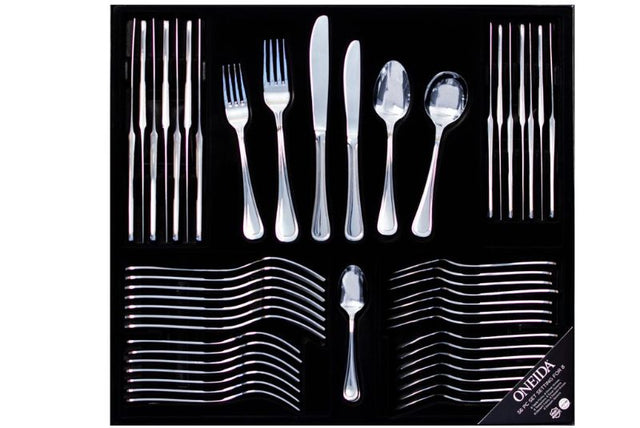 Elevate your dining experience with the Oneida Barcelona 56-piece Cutlery Set. This elegant collection includes 8 table knives, 8 table forks, 8 dessert knives, 8 dessert forks, 8 dessert spoons, 8 euro teaspoons, and 8 soup spoons. Made from durable 18/0 stainless steel, it offers rust resistance and long-lasting shine. The sophisticated silver finish enhances any table setting, making it perfect for everyday use or special occasions. Easy to clean and dishwasher safe, it allows more time for family and friends while keeping your tableware sparkling. With dimensions of W49 x L45 x H6 cm and weighing just 4.2kg, the Oneida Barcelona Cutlery Set fits comfortably in your kitchen drawers. Investing in quality cutlery is crucial for any home, and this set combines utility with style. Transform your dining experience today with this timeless cutlery set that promises to impress your guests and elevate your meals.