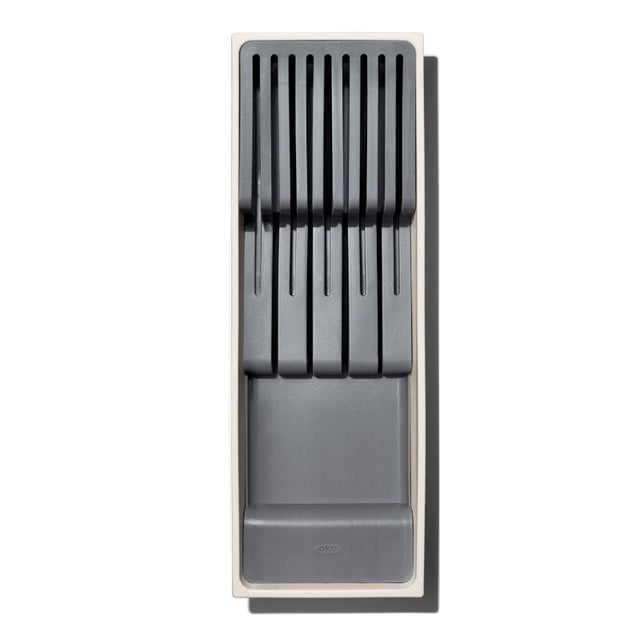 Transform your kitchen organization with the OXO - Compact Knife Drawer Organiser, available at Smartfox AU. This innovative knife storage solution not only saves valuable countertop space but also provides a safe and tidy method for storing your knives. Designed to fit seamlessly into your drawer, the OXO Knife Drawer Organiser features designated slots that accommodate up to five small knives and four large knives, ensuring each blade has its own secure position. The sleek, compact design with square corners eliminates unsightly gaps, giving your kitchen a clean and professional appearance.