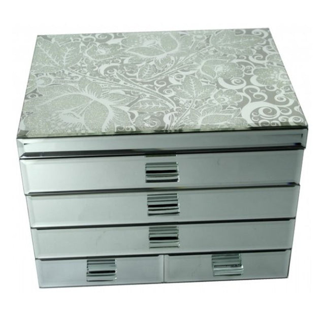 H:22.5 x W:30 x D:23.5 cm - Carton: 2 units - Glass mirror patterned jewellery box with top opening storage area felt lined split into 3 compartments & ring storage + 4 drawers.