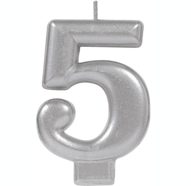 Illuminate your celebrations with our #5 Silver Metallic Numeral Moulded Candle, a stunning addition to any birthday cake or milestone event. At 8cm tall, this elegant candle is designed to catch the eye with its shimmering silver finish, making it perfect for both kids' birthdays and adult celebrations. Crafted from high-quality, non-toxic materials, this numeral candle burns evenly and beautifully, ensuring that your special moments shine bright. Ideal for creating unforgettable memories, the #5 Silver Candle effortlessly complements any party theme, from glamorous to playful. Whether you're planning a sweet birthday celebration or an anniversary party, this metallic numeral candle adds a touch of sophistication and fun to your decor. Enhance your cake presentation and delight your guests with this stylish and festive candle. Perfect for dessert tables, this #5 candle is a must-have for anyone looking to make their occasion extra special. Order your Silver Metallic Numeral Candle today and light up your celebrations with a modern twist!