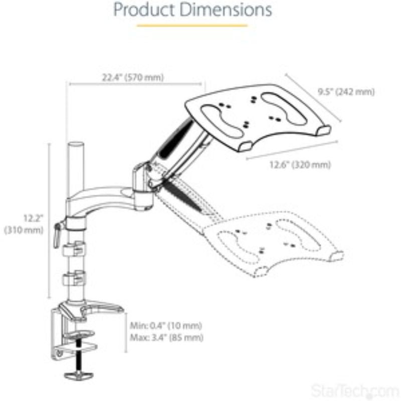 This Desktop Mount Laptop Arm enables you to raise your laptop off your desk and position it to increase ergonomics and productivity. Alternatively, you can mount a monitor up to 34"" (16:9 or 21:9). The laptop/monitor arm supports up to 17.7lb / 8kg in weight, and it features cable management, one-touch/spring-assisted height adjustments along the 12.2"" pole while extending up to a total height of 22"" from the surface of the desk. Laptop and Monitor Support The laptop tray offers an area of 12.6""x9.5"" to support your laptop up to 17.7lb/8kg, and it is fully adjustable to your viewing angle and height. When not using this arm as a laptop mount, you can mount monitors up to 34"". The VESA mount offers a full range of motion that will adjust to your setup and ergonomics needs, When using it as a notebook mount, your laptop will need additional security at steeper angles (not included). Create an ergonomic setup This full motion monitor arm lets you extend, tilt, and swivel your monitor and laptop with a full range of motion across multiple axes, with spring-assisted height adjustments for effortless positioning. It makes it easy to create an ergonomic work environment that's tailored to your specific needs. The monitor arm is perfect for smaller work environments, like cubicles, providing everything you need while using less space. Easy Installation Install this laptop/monitor arm alo