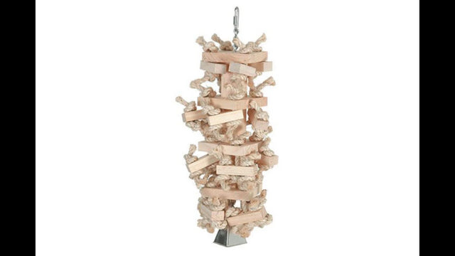 The Featherland Paradise Bo Jangle with thick wooden pieces a perfect toy for large birds such as Macaws or Cockatoos to promote biting and chewing. The cotton rope that these wooden pieces are strung on can also provide an excellent opportunity for preening. We also added a bell at the end for extra sound stimulation. The quick link allows the toy to attach to virtually any birdcage.