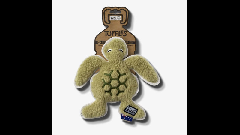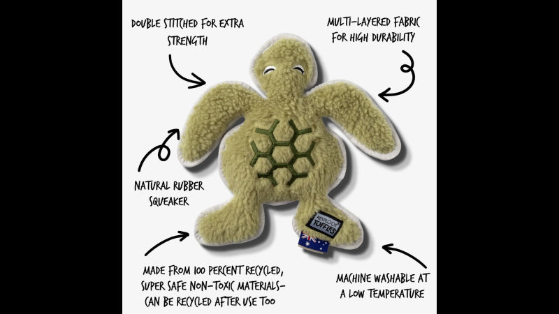Introducing the Resploot Tuffles Turtle 26cm, the eco-friendly dog toy that combines durability and playfulness with a mission to protect wildlife. Made for dogs and puppies who enjoy rough play, this delightful turtle is crafted from 100% recycled materials, ensuring that your furry friend plays sustainably. The multi-layered fabric and robust double stitching offer exceptional durability, making it ideal for energetic playtime. Each purchase contributes to WWF's conservation efforts, helping to protect endangered species like the Hawksbill Turtle. The Resploot Tuffles Turtle not only entertains your pet but also educates, featuring unique stories about endangered animals that inspire conversations about wildlife preservation. Perfect for dogs that love to tug, fetch, and cuddle, this toy is a conscious choice for pet owners who care about the planet. Discover the joy of play with a purpose and give your pet a toy they can love while making an impact on the environment. Choose the Resploot Tuffles Turtle for a fun-filled, guilt-free playtime experience!