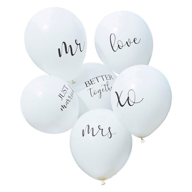 Product details: These white sripted slogan wedding balloons decorations say it all. Add a touch of class to your wedding balloon decor with a bunch of these black and white slogan balloons. Each pack contains 6 x 12inch balloons with various slogans.