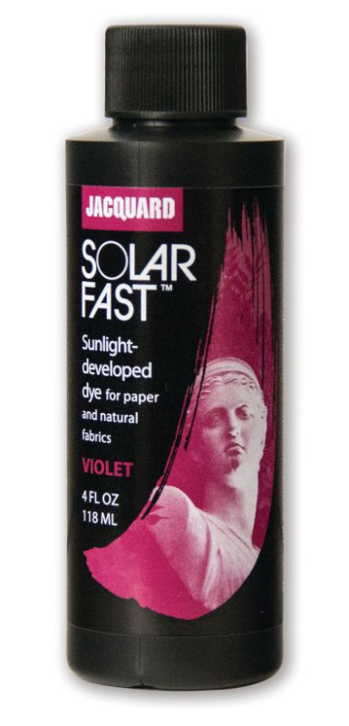 SolarFast dyes only develop color and become permanent upon exposure to sunlight (UV). This unique property means SolarFast may be used to create remarkably detailed photographs, photograms and shadow-prints on paper or fabric by harnessing the power of the sun! Anything you place on the painted surface to block the light will create a printed impression in a matter of minutes, whether a solid object (toys, tools, plants, lace, etc.), a photographic negative (an image digitally printed onto a transparency)* or shadow (from folds in the fabric or a 3D object). SolarFast dyes are also great for painting, tie dyeing, screen printing, stamping, batik and more”no heat setting, chemical or steam fixing necessary. The dye leaves fabric completely soft to the touch. On paper, it has zero relief and will not affect the texture of the surface whatsoever, making it a powerful tool for mixed-media arts.