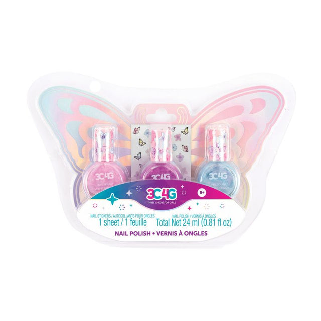Master at-home manicures with these shimmering nail polish colors and butterfly nail stickers. These 3 glossy polishes are made to mix and match, whether your fashionista sticks to a modern monochrome or paints each nail a different color, the finished look will always be trendy. These high-shine pigments last through playtime and come off simply with nail polish remover to make changing it up easy-peasy. Safe to use, fun to wear, win-win. Whether it’s a birthday bash, playdate or slumber party, these shimmering colors and cute nail stickers offer up the perfect playtime activity for little ones to explore their fun, creative sides. Polish is water-based, comes in 3 8mL glass bottles and is tested for use by children. PERFECT FOR AGE 8+