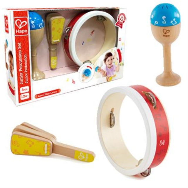 Hape Junior Percussion Set Bang out a steady rhythm with this three-piece percussion set! Includes a tambourine, a maraca and a clapper. Age: 12+ Months
