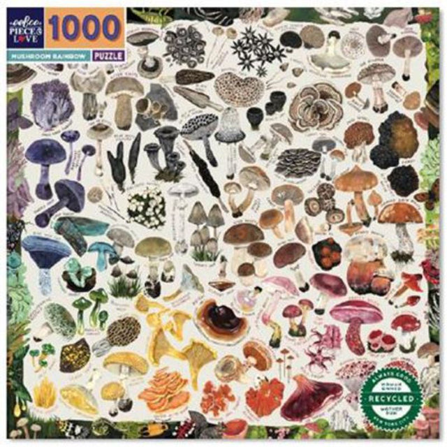 Immerse yourself in the vibrant world of fungi with the eeBoo Mushroom Rainbow 1000 Piece Puzzle. This beautifully illustrated puzzle by Kelsey Oseid features an array of enchanting mushrooms, including Shiitake, Red Amanita, and Oyster, among many others. As you assemble this exquisite 1000-piece puzzle, you'll not only experience the joy of piecing together these colorful fungi but also enhance your knowledge of each unique mushroom variety. The finished puzzle measures a generous 23 x 23 inches, making it a perfect display piece for any nature lover or puzzle enthusiast.
