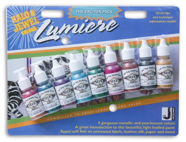With its easy application and excellent coverage, the JACQUARD LUMIERE HALO/JEWEL EXCITER PACK 9 encourages users to experiment with mixed media and layering techniques. Create shimmering effects or bold accents - the choice is yours! Don’t miss out on the opportunity to elevate your projects with these extraordinary paints.