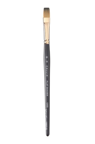 The flat shader is composed of medium-length bristles that taper to a chisel edge, allowing for a wide range of applications. A good-quality flat will have spring and will snap back to shape when bent gently. A flat can apply broad strokes or a fine line, when used on the chisel edge.