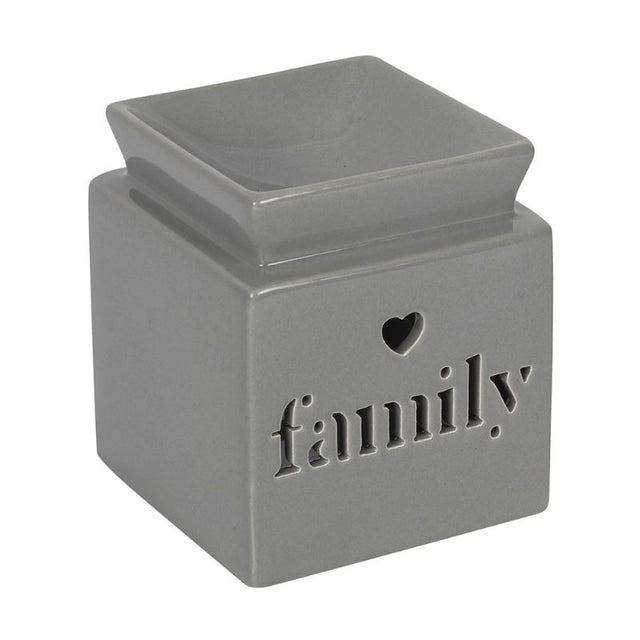 H:12 x W:10 x D:10 cm. This grey ceramic oil burner features a cut-out heart and 'family' text in a cute, contemporary design. Place fragrance oil or wax melts into the built-in dish with a standard tealight inside to fill the home with calming fragrance.