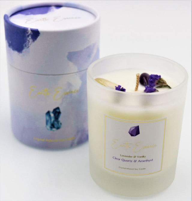 Transform your space with our exquisite Soy Wax Candle - Crystal Lavender Vanilla, thoughtfully crafted to elevate your ambiance. Measuring 9.3cm, this luxurious candle features a harmonious blend of soothing lavender and sweet vanilla, perfect for creating a tranquil atmosphere in any room. Enhanced with handmade Amethyst and Clear Quartz crystals, this candle not only provides a warm light but also infuses your space with calming energy. Each candle is adorned with delicate dried Forget-Me-Not flowers, adding a touch of natural beauty. With a generous 40-hour burn time, you can enjoy long-lasting tranquility and delightful fragrance. Ideal for relaxation, meditation, or as an elegant home décor piece. Illuminate your life with this aromatic soy wax candle and experience the perfect balance of nature's finest scents. Bring a piece of serenity into your home today with the Crystal Lavender Vanilla candle from Smartfox AU, where quality and sustainability meet.