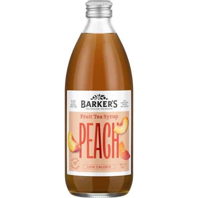 Indulge in the refreshing taste of Barkers Tea Syrup Peach Fruit 500mL, your go-to solution for delicious, fruit-forward beverages. This premium peach and lemon tea syrup is expertly crafted to deliver a tantalizingly sweet, yet low-calorie infusion that makes every sip a treat. With no artificial colors, flavors, or preservatives, you can enjoy a purely delightful experience without compromise. Our fruit tea syrups blend perfectly with tea, fruit, and botanicals, offering a versatile base for your creative beverage creations. Whether you prefer hot, cold, or sparkling drinks, this peach fruit tea syrup can elevate your drink game. Each recyclable glass bottle provides 17 generous servings, allowing you to mix up your favorite iced teas, hot brews, or refreshing sparkling spritzers with ease — no brewing required! Discover the joy of flavored beverages at home with Barkers Tea Syrup, where quality and taste meet convenience. Perfect for those looking for natural, delicious ways to stay refreshed, our tea syrup is a must-have for any health-conscious individual or beverage enthusiast. Ideal for parties, picnics, or a quiet afternoon treat, the Peach Fruit Tea Syrup invites you to explore endless mixing possibilities.
