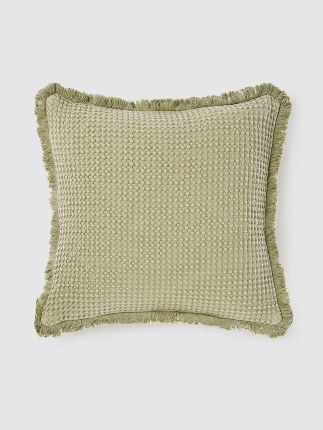 Soft and textural, Saltwater’s waffle weave in washed cotton offers a timeless aesthetic. Trimmed with cotton fringing for a rustic touch, This cushion exudes an easy-living vibe that will work in any space. Its breathable, tactile fabric adds both comfort and character to your home. Available in Hydrangea and Gumtree.